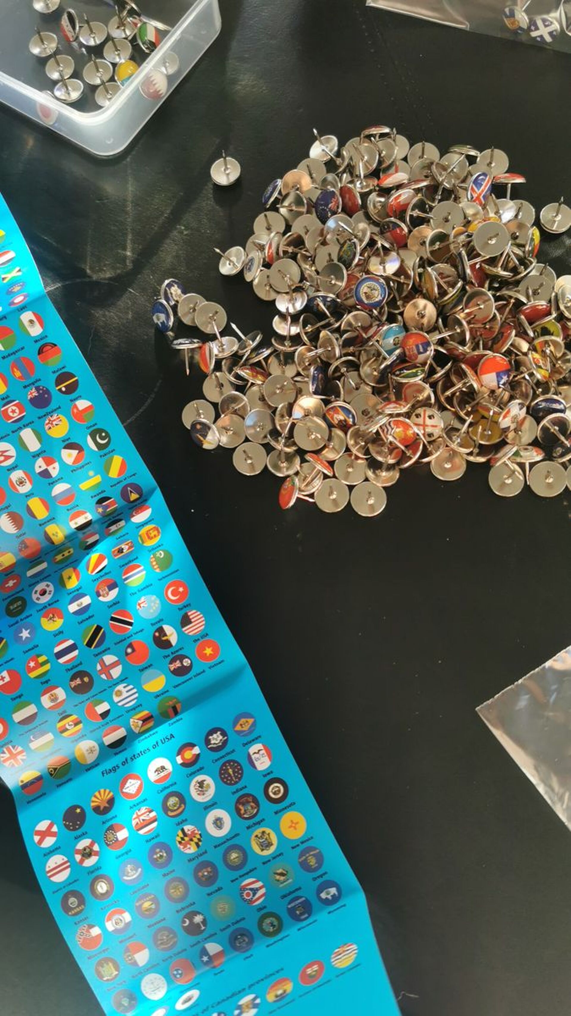 Pionezele pot fi fixate pe o varietate de materiale (de exemplu, lemn, placaj, plută, carton spumă etc.). Dacă doriți să utilizați pioneze cu hărțile noastre din lemn, puteți utiliza un clește pe spate pentru a îndepărta partea cu pioneze. Apoi, folosind o bucată mică de bandă adezivă cu două fețe, atașați partea cu steagul la harta în sine (funcționează cel mai bine în special pentru țările mai mici pe hărți din lemn mai mici).